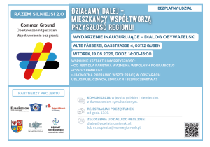 we wtorek, 19 maja 2026 r., w Starej Farbiarni w Guben odbędzie się pierwszy dialog obywatelski w ramach projektu „Wspólnie silniejsi 2.0”.