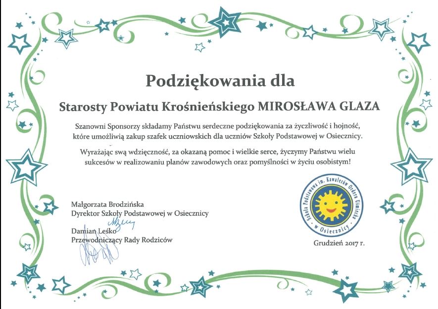 Podziękowania dla Starosty Krośnieńskiego Mirosława Glaz
